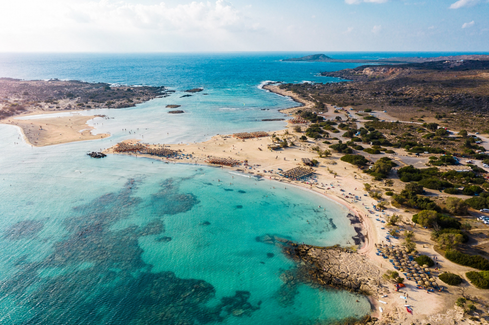 Bei ruhigem Wetter ohne Wellengang ist Elafonísi mit der Hauptinsel Kreta durch einen Sandstreifen verbunden. Der Sandstrand ist durch winzige Muschelteilchen rosa gefärbt. Der Bereich hinter dem Strand ist mit Tamariskenbäumen bestanden.